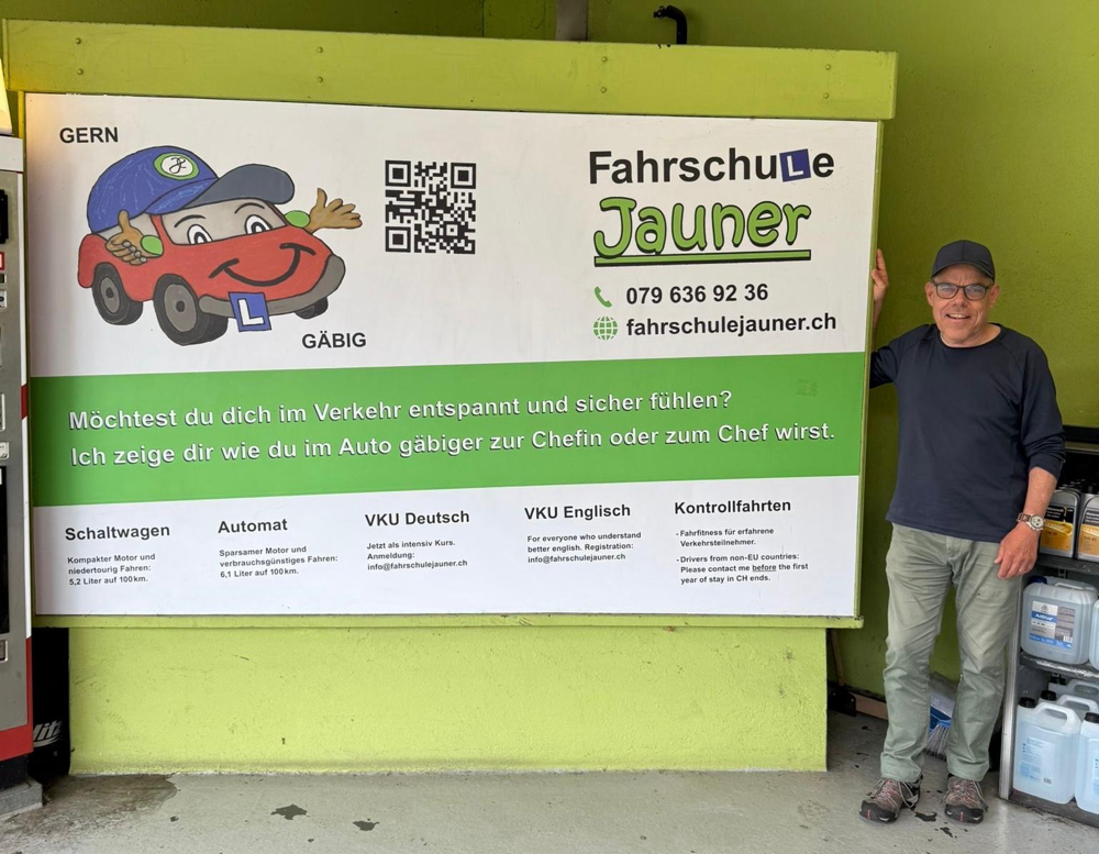 De Jauni begrüsst dich beim günstig Tanken bei der Argovia Tankstelle in Nussbaumen und wünscht dir einen entspannten Tag.